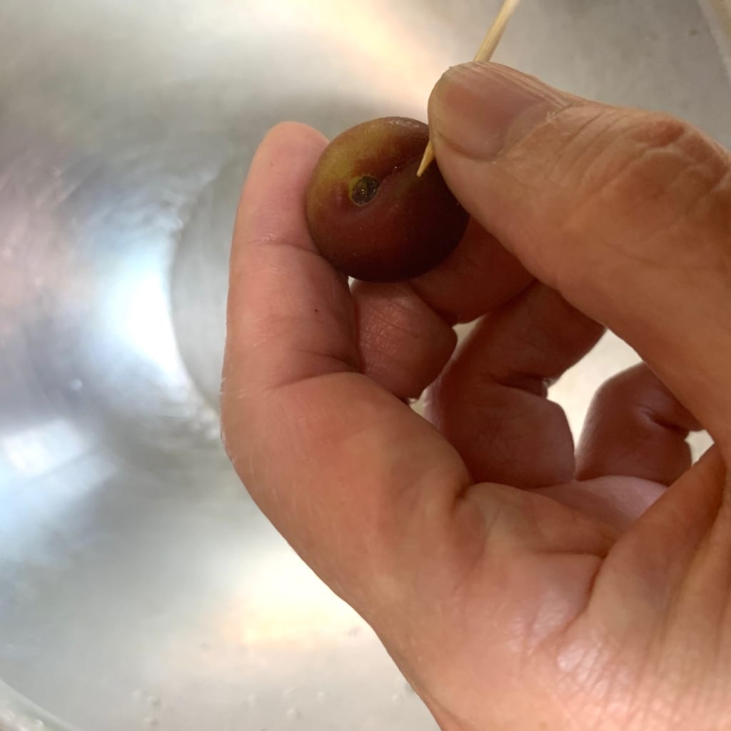 爪楊枝でヘタを一つ一つ丁寧に取り除きます