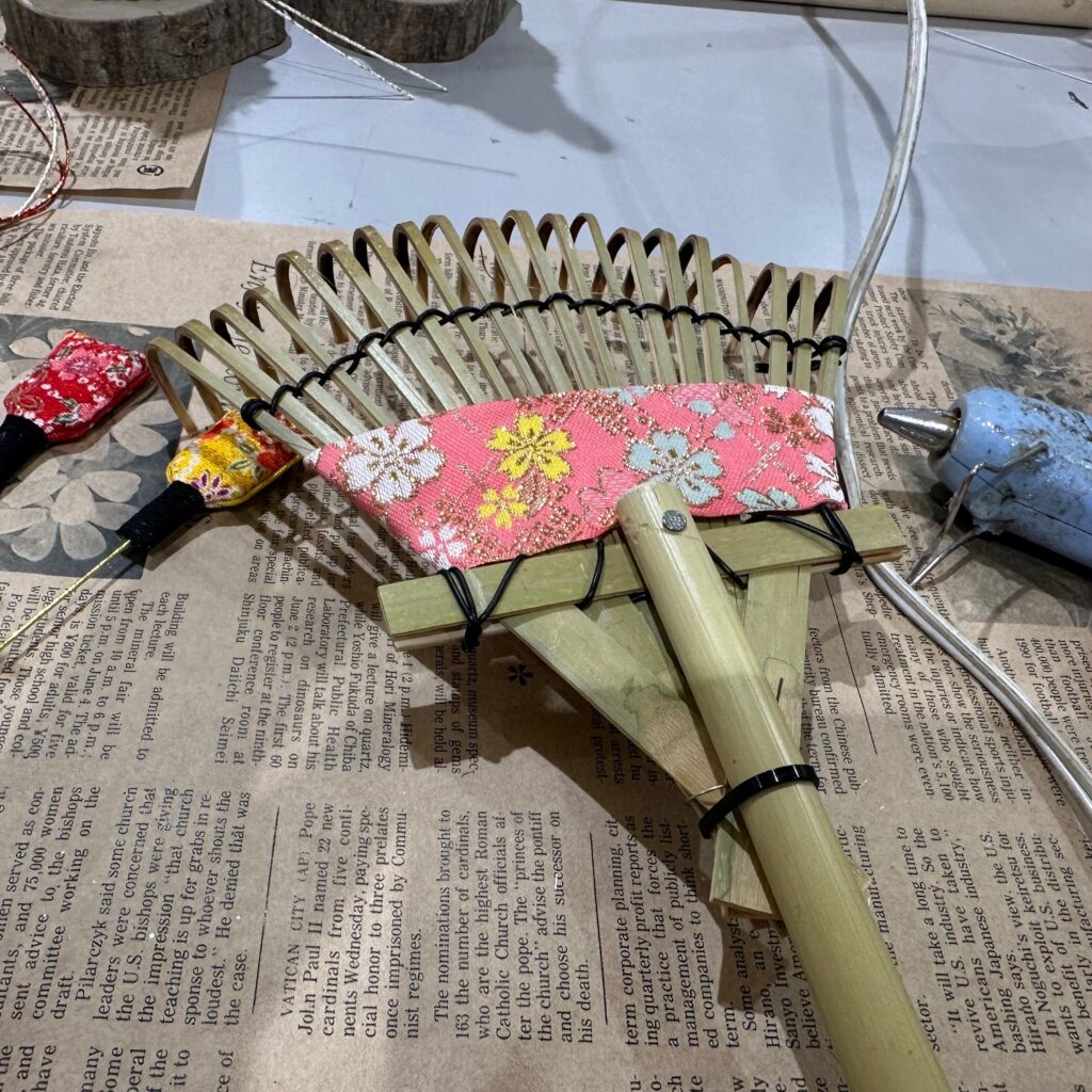 42cmほどの熊手にめでたいアイテムを付けて福をかき集める熊手を作ります